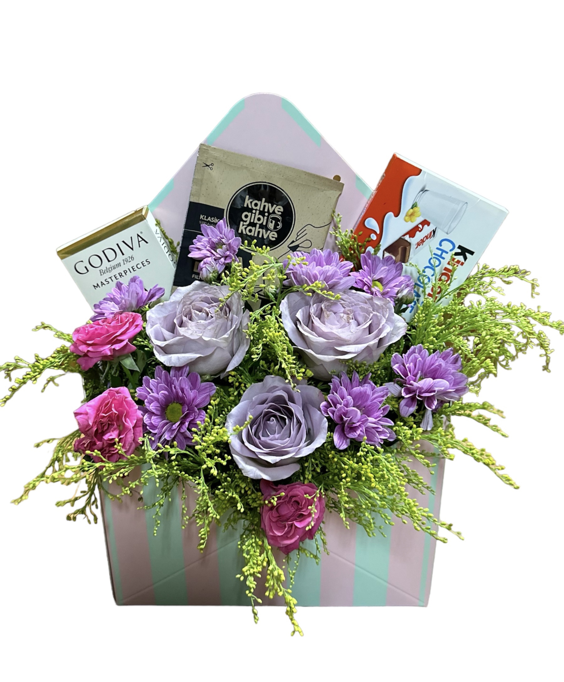 Özel olarak tasarlanmış kutu zarf içerisinde Lila Gül, Pembe Çardak Gül, Renkli Papatyalar, Soly ve Okaliptus ve Godiva Chocolate, Kahve gibi Kahve, Kinder Chocolate birleştirdik ve tasarım çiçek aranjmanı haline getirdik.