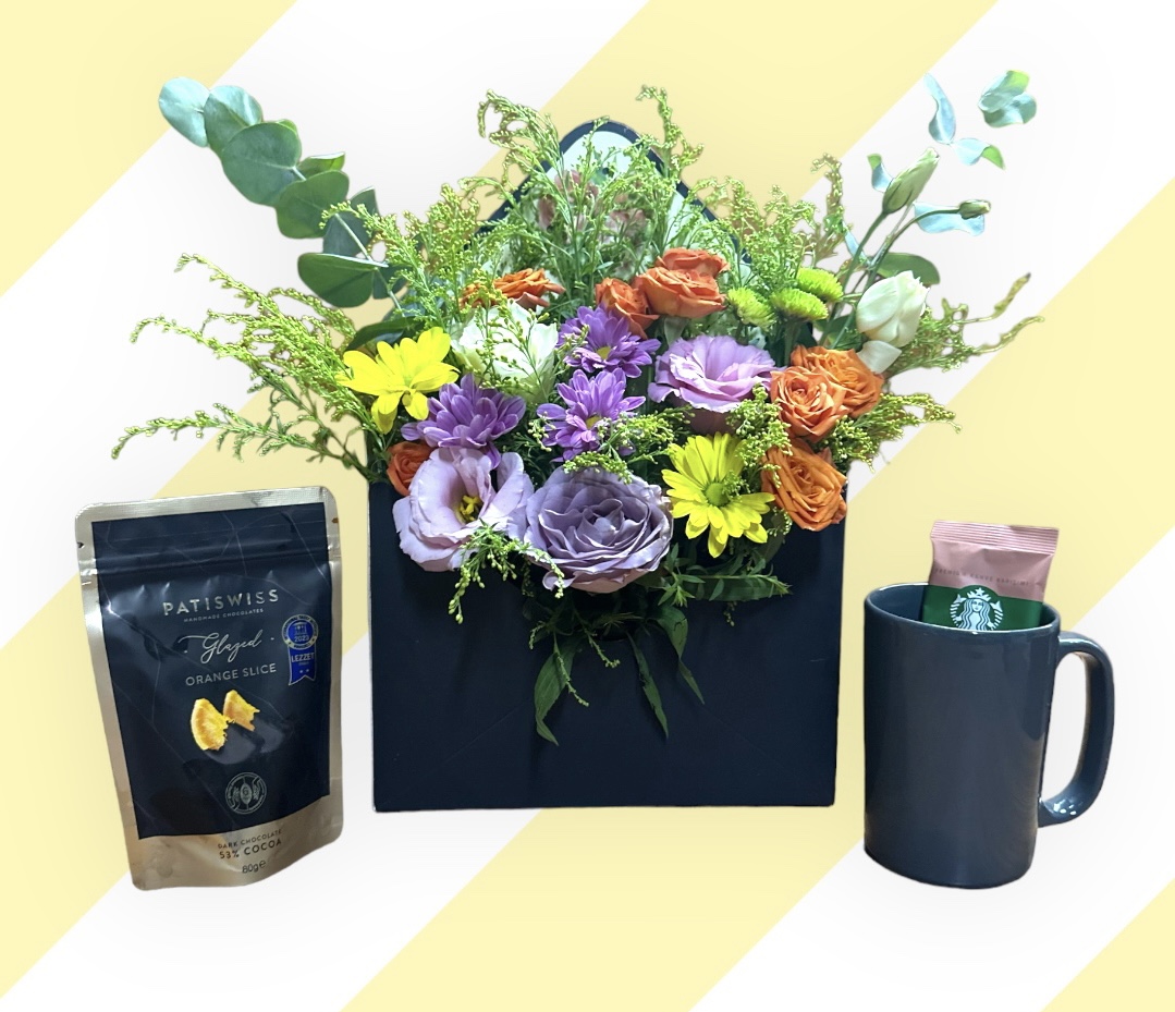 Özel olarak tasarlanmış kutu zarf içerisinde Lisyantuslar, Papatyalar, Turuncu Çardak Güller, Mevsim Yeşillikleri ve Patiswish Chocolate, Starbucks Premium Coffee, Kahve Kupasını birleştirdik ve tasarım çiçek aranjmanı haline getirdik.