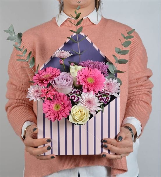 Özel olarak tasarlanmış desenli zarf kutu içerisinde Innocent Angel Şebboy, Renkli Güller Renkli Papatyaları birleştirdik ve tasarım çiçek haline getirdik ve tasarım bitki aranjmanı haline getirdik.
