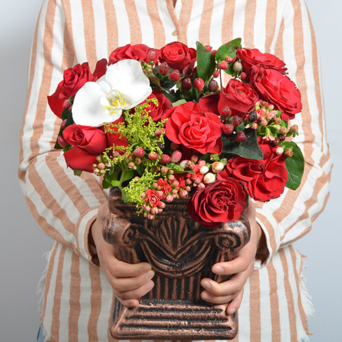 Larina Özel Tasarım Seramik Saksıda Kırmızı Gül, Hiperikum, Soly, Beyaz Kandil Orkide ve Mevsim Yeşilliği