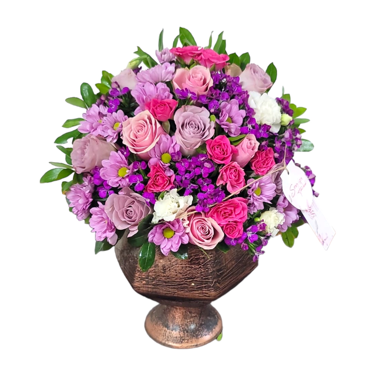 Özel olarak tasarlanmış tasarım saksısı içerisinde lila gül, pembe gül, lila papatya, husnu yusuf, çardak güller ve mevsim yeşilliklerini birleştirdik ve tasarım çiçek haline getirdik ve tasarım çiçek aranjmanı haline getirdik.
