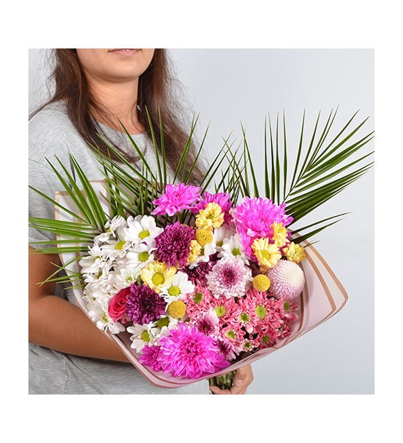 Madrid Çizgili Özel Tasarım Çiçek Jelatinine Sarılmış Renkli Papatyalar, Felix ve Mevsim Yeşillikleri. Madrid hakkında bilmeniz gerekenler şeyler var! Madrid sana ulaştıktan sonra uzun süre taze kalabilmesi için öncelikle temiz su ve temiz bir vazoya ihtiyaç duyar. Bir de doğrudan maruz kalmayacağı şekilde güneş ışığı görmek ister. Bu güzel buketi teslim aldıktan sonra içerisinde bulunan çiçekleri vazoya yerleştirilmeden önce suya değecek kısımlardaki yapraklarını temizlemen ve saplarını uçlarından verev keserek suya koyman gerekiyor. Zarif, şık ve eşsiz bir çiçek göndermek isteyenlerin bir numaralı tercihi Madrid. Yaklaşık Buket Boyutu: 50-55 cm