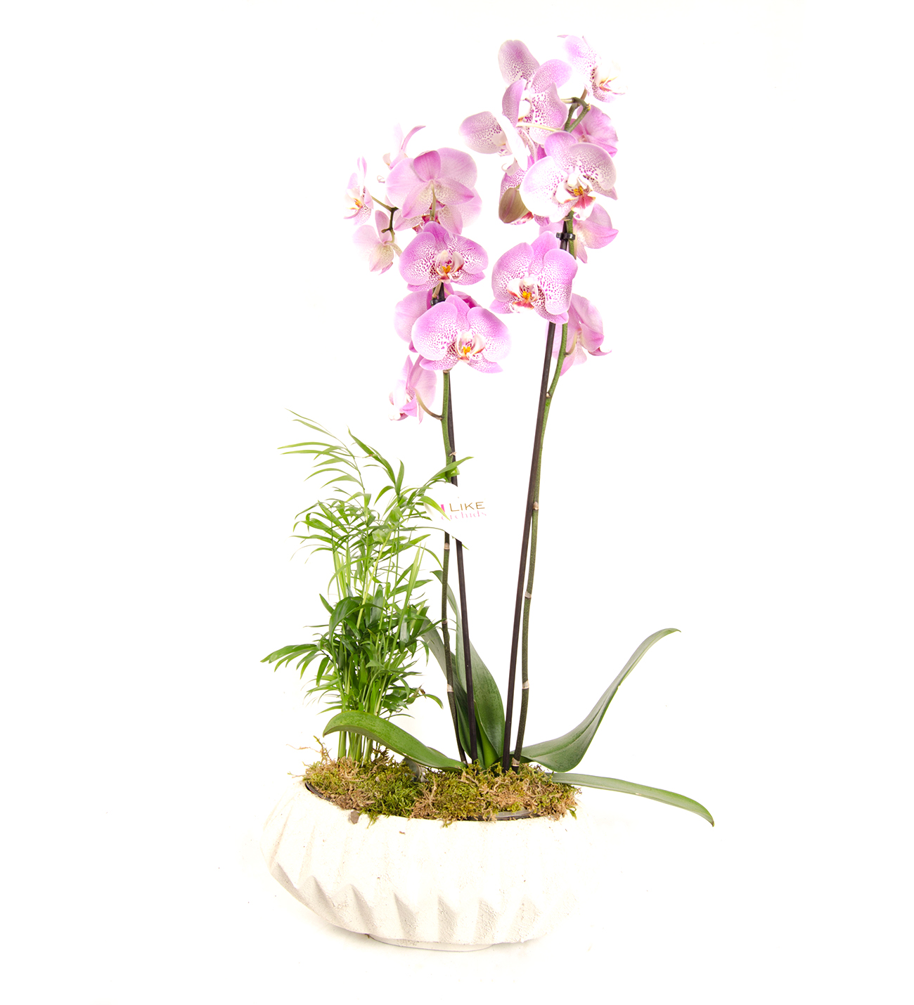 Ürün İçeriği: Dekoratif Dizayn Saksıda Çift Dal Desenli Pembe Orkide ve Chamaedorea