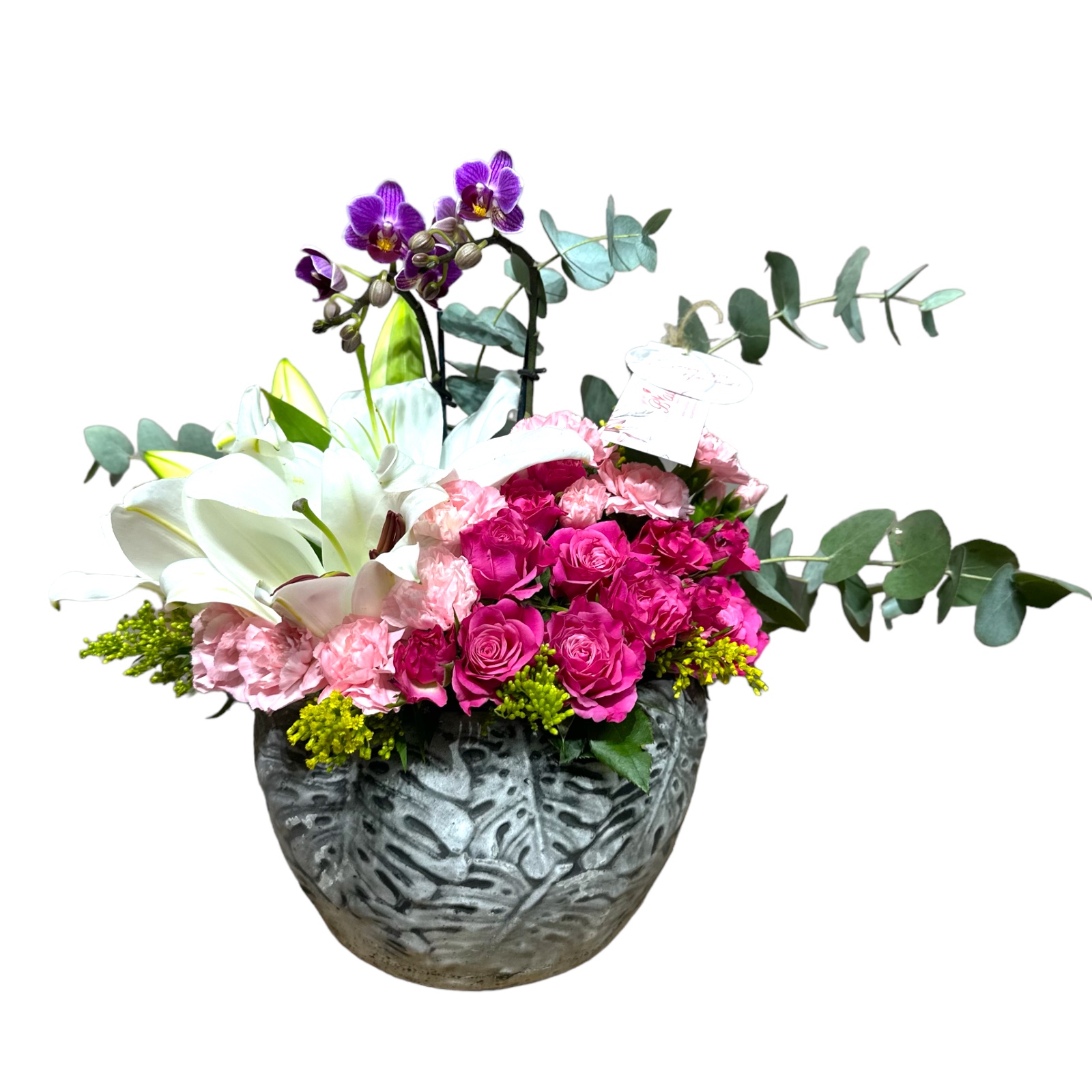 Özel olarak tasarlanmış oval seramik içerisinde Çift Dallı Mini Mor Orkide, Lilyum, Pembe Çardak Gül, Soly ve Okaliptüs Çiçeklerini birleştirdik ve tasarım çiçek aranjmanı haline getirdik.