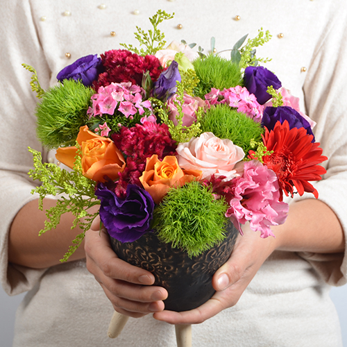 Rosaline Özel Tasarım Seramik Saksıda Mor Lisyantus, Beyaz Lisyantus, Turuncu Gül, Pembe Gül, Mevsim Hüsnü Yusufları, Yeşil Toplar, Soly ve Mevsim Yeşilliği