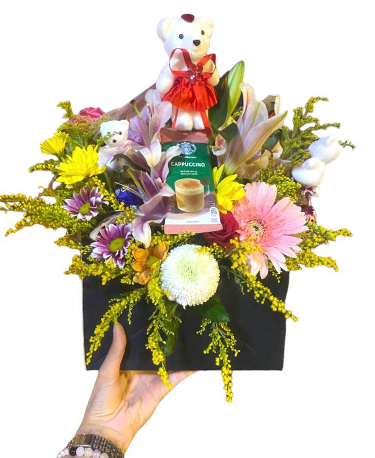Özel olarak tasarlanmış siyah kutu zarf içerisinde Renkli Papatyalar, Pembe Lilyum, Pembe Gerbera, Soly, Anastasia, Oyuncak Ayıcıklar, Kahve Dünyası Lavi Çikolata ve Starbucks Premium Kahve'yi birleştirdik ve tasarım çiçek aranjmanı haline getirdik.