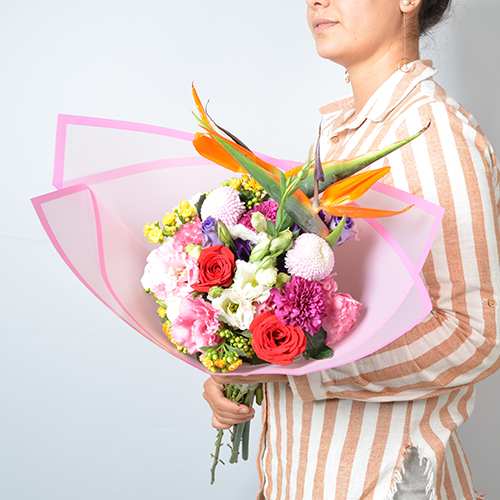 Samara Çizgili Özel Tasarım Çiçek Jelatinine Sarılmış Renkli Güller ve Mevsim Yeşillikleri.