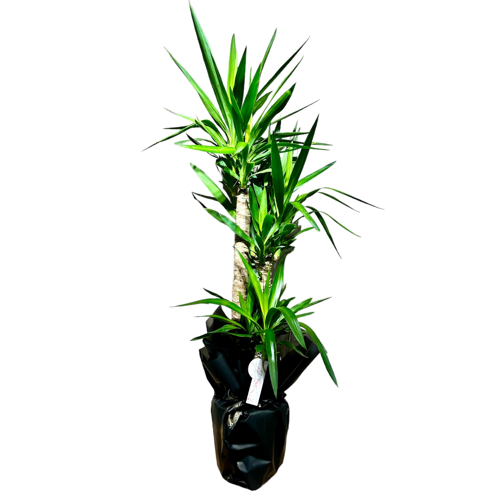 Özel olarak sarılmış Yucca Bitkisi (Çift Gövdeli Yuka Çiçeği) bitkisini tasarım bitki aranjmanı haline getirdik.